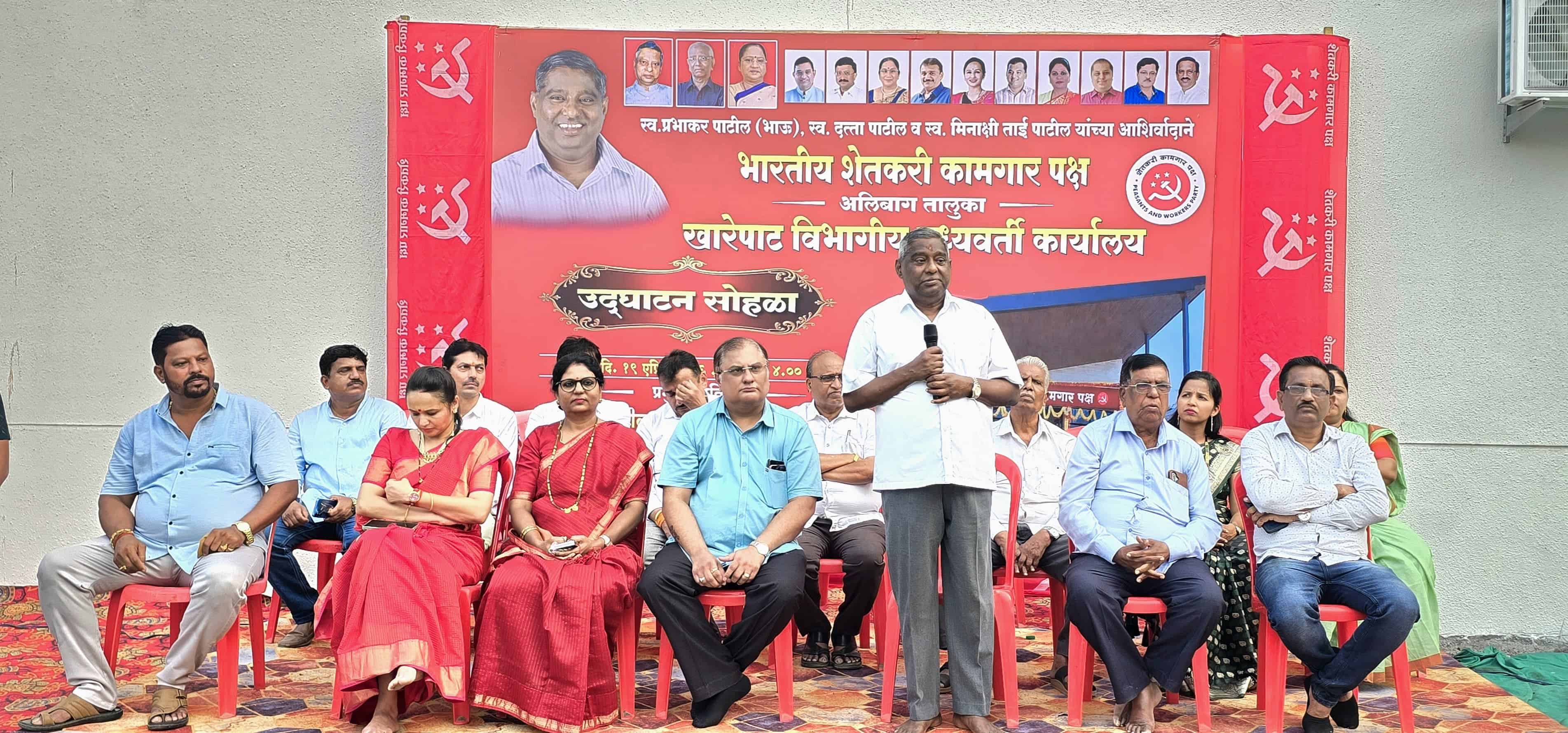 अलिबाग (प्रतिनिधी): पेझारी नाक्याजवळ खारेपाट विभागीय शेतकरी कामगार पक्षाच्या नव्या कार्यालयाचे उद्घाटन शेकाप सरचिटणीस जयंत पाटील यांच्या हस्ते उत्साहात पार पडले. अद्ययावत कार्यालयातून सर्वसामान्यांचे प्रश्न सोडविण्यावर भर देण्याचे आवाहन त्यांनी केले.